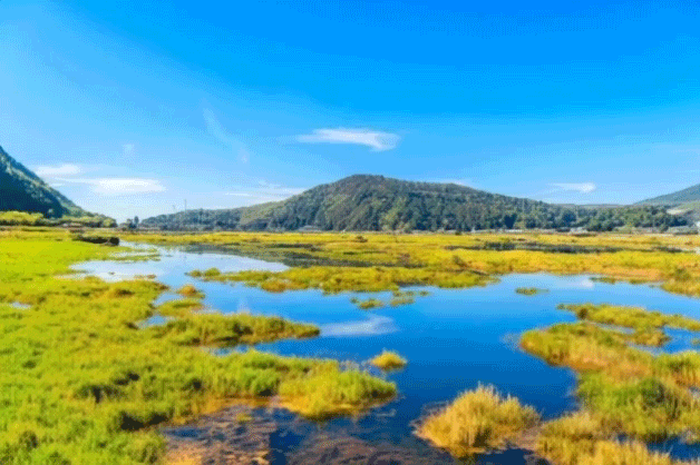 C、腾冲游览【北海湿地】,被誉为“水上草原”,四面环山,属高原火山堰塞湖生态系统。