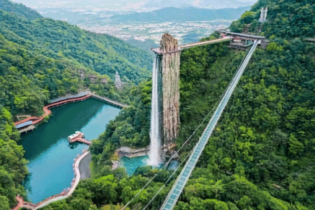 ☆☆游览【云上飞瀑】挑战多项世界纪录电梯观景瀑布,大瀑布出水口宽8米,从顶端直流而下,一泻到底,其落差高达168米,相当于五十层楼的高度,瀑布内安装3台观光电梯,每台观光电梯可同时容纳15人,是国内罕见的瀑布与电梯的观光组合游玩项目,飞瀑顶端设80米长的玻璃观景平台供游客观景,站在观光平台上,可以直接俯瞰谷底的无限美景[电梯如需乘坐自由付费便可以]。