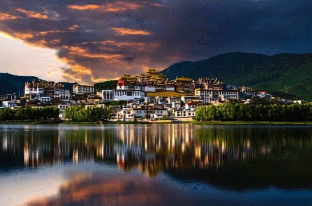 E、入住茶马古道重镇-【独克宗古城】,高原夜空,星星似眸子一样晶亮,登龟山公园转动世界吉尼斯纪录的转经筒,观【松赞林寺】夜景。