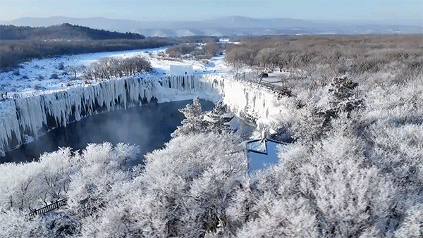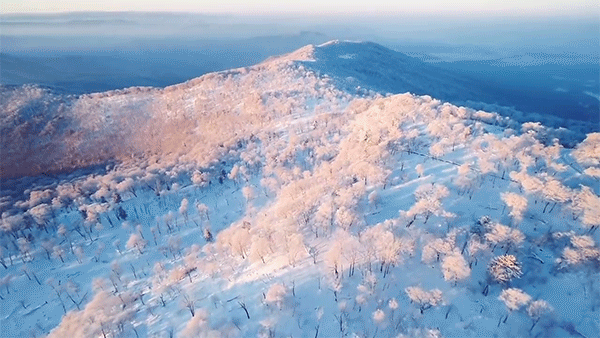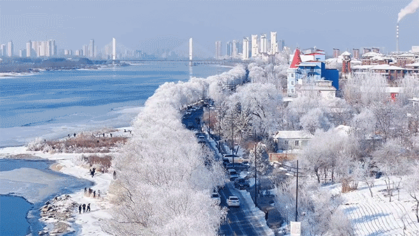 G、前往吉林,游览松花江畔观赏雾松最美地——【雾松长廊】清晨雾锁寒江,那洁白的雾凇已被染成红色。
