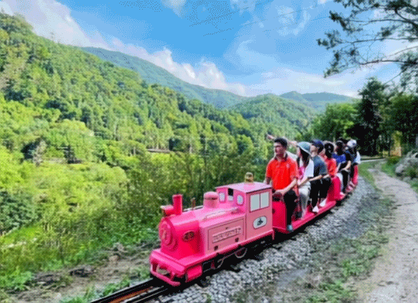 ☆☆之后游玩【天露山网红环山小火车】采用复古的蒸汽设计,身披雾气、鸣着汽笛,扑哧扑哧地行驶在伸向远方的铁轨上,仿佛重回那段朴素的蒸汽时代。 乘坐在小火车上,微风略过,云淡风清,穿过丛林、越过花海,这般体验,简直浪漫爆表,妙不可言!