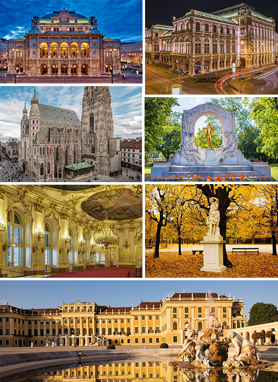 D、前往奥地利的首都-【维也纳】,位于奥地利东北部阿尔卑斯山麓,多瑙河的南岸,浓缩了古希腊罗马时期以来的艺术,游览或外观【维也纳皇家歌剧院】+【新雅典式议会大厦】+【维也纳市政厅】+【施特劳斯雕像】+【圣史蒂芬大教堂】+【美泉宫后花园】。更可自由另自费参观